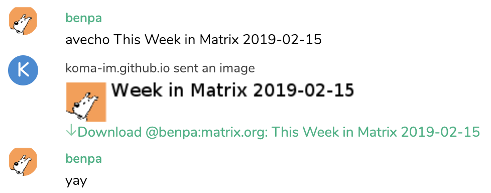 There is no big news about mautrix-whatsapp this week, other than that I installed it on my own server and found that it works really really well. I'd love to switch to this as a main interface for my less-decentralised friends, but like others, I've been stung by this issue in an upstream project. If there are go-fans reading (and I know there are), I wonder if it's an issue which can be fixed?